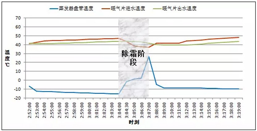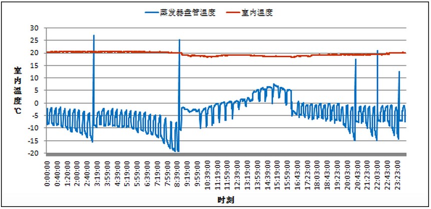 本文選取了2016年12月19日這一天重霧霾天氣,北京市發布了霧霾橙色預警并進行了交通限行。由于北方冬季氣溫低,霧霾、下雪天氣多,極容易造成空氣源熱泵蒸發器大面積結霜,影響制熱效果。從本次監測中選取重霧霾天氣,濕度高,同時氣溫-4℃~8℃也是機組容易結霜的階段。