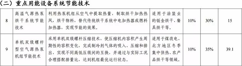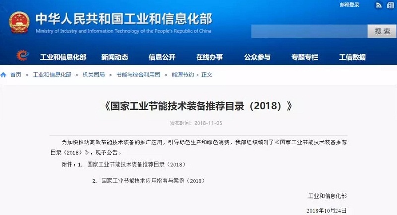 2018年11月5日,工業和信息化部發布《國家工業節能技術裝備推薦目錄(2018)》公告,其中“高溫氣源熱泵烘干系統節能技術、單機雙級螺桿型空氣源熱泵機組節能技術”兩項空氣源熱泵技術、案例成功入選《國家工業節能技術裝備推薦目錄(2018)》及《國家工業節能技術應用指南與案例(2018)》。