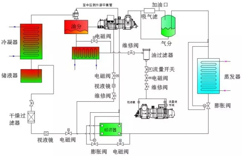 2.技術原理及工藝單機雙級螺桿壓縮超大型空氣源熱泵機組是一種基于逆卡諾循環原理建立起來的節能、環保、制熱高效、集熱并轉移熱量的裝置。采用單機雙級螺桿壓縮技術,使壓縮機內容積產生周期性的容積變化,完成制冷劑氣體的吸入、壓縮和排出,實現不同高低壓級間的互換,并通過與實際工況合理搭配排量比,達到機組最優運行狀態。系統原理圖如下: