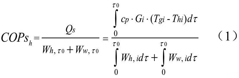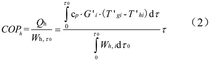 式中:T0為時間,S;Qs為T0時間內熱泵系統的總供熱量,kJ;Wh,r0為T0時間內熱泵機組的耗功量,kJ;Ww,r0為T0時間內循環水泵的耗功量,kJ;cp為水的比熱容,取為4.2;Gi系統循環水質量流量,kg/s;Wh,i為i時刻熱泵機組功率,kW;Ww,i為i時刻循環水泵功率,kW;Tgi和Thi分別是i時刻系統供回水溫度,℃。