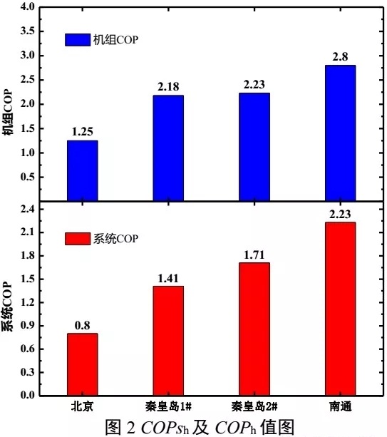COPsh值更是顯著降低,北京某辦公樓的COPsh值僅為0.8,秦皇島1#辦公樓、2#辦公樓COPsh值分別為1.41、1.71,南通某辦公樓由于COPh值相對較高,COPsh值達到了2.23。可見,調查的4個綠色建筑空氣源熱泵系統實際運行效果不佳。