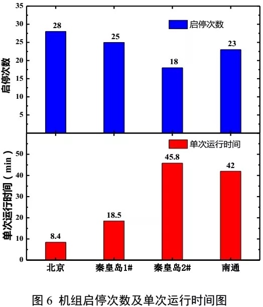 圖6為各項目空氣源熱泵機組啟停次數以及機組平均單次運行時長。北京某辦公樓、秦皇島1#辦公樓、2#辦公樓、及南通某辦公樓項目機組每日啟停次數分別為28次、25次、18次、23次,機組平均單次運行時長分別為8.4min、18.5min、45.8min、42min。可見,實際運行中空氣源熱泵系統存在機組啟停頻繁問題,北京某辦公樓、秦皇島1#辦公樓項目機組單次運行時長過短,嚴重影響機組性能和供暖效果。