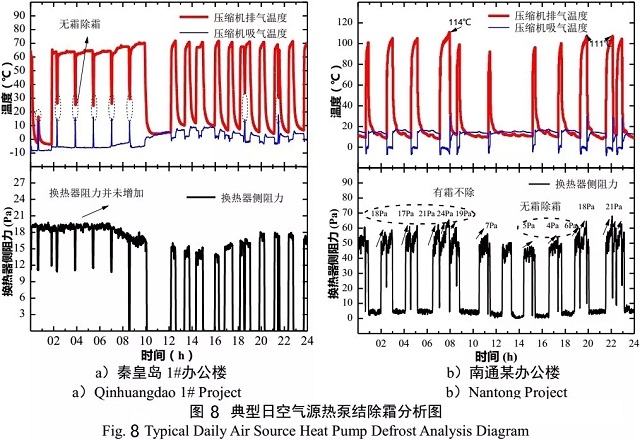 圖8為秦皇島1#辦公樓及南通某辦公樓典型日結除霜分析圖,由圖可得,秦皇島1#辦公樓空氣源熱泵機組在典型日機組發生除霜8次除霜,但其室外換熱器阻力并未增加,8次除霜均為“無霜除霜”事故,典型日內誤除霜概率高達100%。南通某辦公樓空氣源熱泵就典型日發生除霜14次,其中換熱器阻力增加超過40%的“有霜不除”事故7次,壓縮機排氣溫度最高達114℃,接近120℃報警閾值,嚴重影響機組運行穩定性。換熱器阻力增加不足15% 的“無霜除霜”3次,誤除霜概率高達70%。
