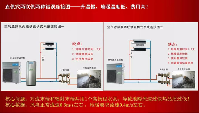 首先,空氣源高效兩聯供和低效兩聯供的主要區別是什么?經差異化實驗對比,主要區別在于地暖末端結構和連接方式。因為大家也清楚低效兩聯供就是空氣源熱泵水機+直供式地暖,所以容易出現問題的地方就是配置的地暖末端系統!