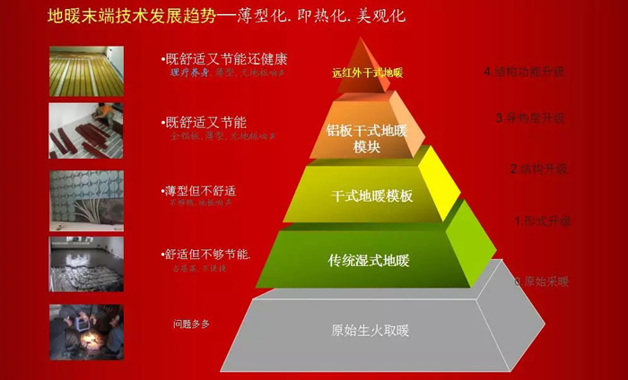 上圖是我做的一個地暖末端在技術上的發展趨勢:薄型化——即熱化——美觀化,這個大家可以看圖了解一下,具體我就不作解說了。