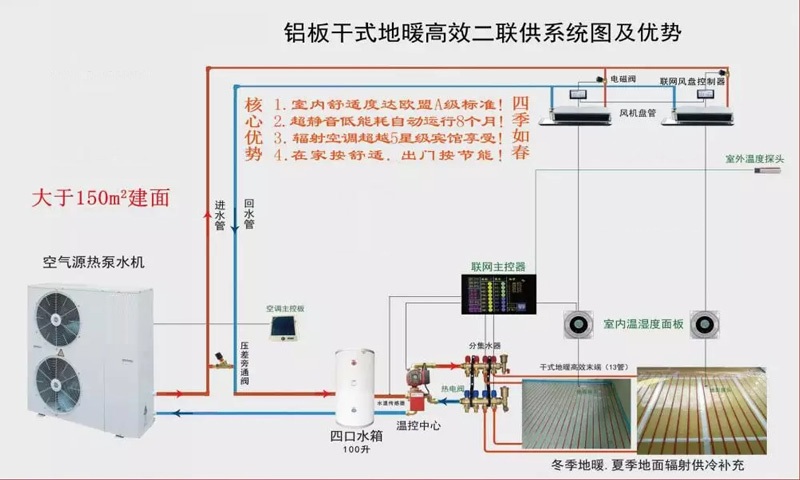2、空氣源熱泵+(水箱+冷暖溫控中心+干式地暖高效末端)=高效二聯供